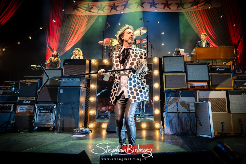 Après l'intro "It's A Long way To The Top" de qui vous savez, les Black Crowes emmenés par un Chris Robinson vêtu d'une veste blanche à pois noirs, débarquent sur une scène avec en premier plan, un mur d'amplis factices du plus bel effet. Pour ce qui concerne le combo, prenons par exemple le cas du jeune batteur qui, lui, est perché sur une plateforme en mode Kiss Alive II, plateforme flanquée d'un grand miroir devant lequel le Chris se pâme tel un Narcisse sur deux titres de Happiness Bastards intitulés respectivement "Bedside Manners" et "Rats and Clowns". Autant l'avouer, le Chrisou, on ne l'entend pas d'entrée de jeu, couvert qu'il est par le mur de décibels produits par le reste du groupe. Un changement de micro s'impose donc. Ceci n'affecte en aucune façon l'énergie des Corneilles prêtes à s'envoler vers un "Twice As Hard" délivré dans une version incandescente.