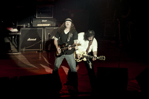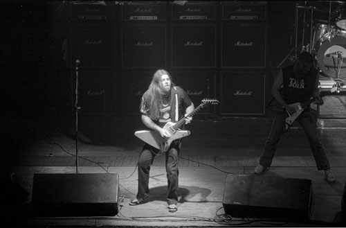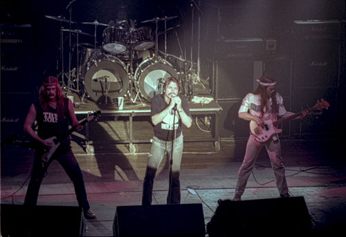 The surprise gone and the ears scrubbed, we can enjoy the music of our favorite band. Dave Hlubek is the first solo on "Bloody reunion". He plays in an aggressive way, martyring his white Hamer (which he will swap just afterwards for a Gibson Les Paul) and waving his long hair. Duane Roland, with his red bandana and drooping mustache, is more relaxed and plays cushy on a black and white Gibson Flying V. Steve Holland is armed with a black Stratocaster and delivers a rhythm of steel. New bassist Riff West, with his long hair and Blackfoot Indian style, keeps moving while hitting his bass and the latest drummer BB Borden turns out to be an outstanding hammer. This nasty gang is masterfully led by singer Danny Joe Brown, one hell of a guy with an impressive height (now I understand why the roadie was tiptoeing when testing the mic) and a hoarse, loud, Jack Daniel's dripping voice.