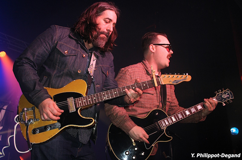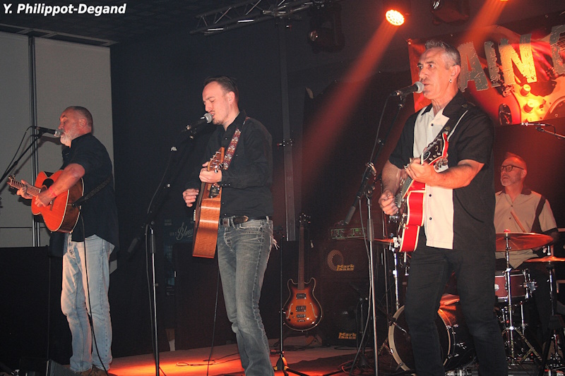 Les portes s’ouvrent, et il revient à Thierry de présenter le groupe chargé des inter-scènes et de donner le départ de leur premier intermède. Ce soir, l’honneur revient aux Customers, quatuor breton à géométrie instrumentale variable bien porté sur la musique des années 50, avec un mélange entre débuts du rock’n’roll, country, blues et rockabilly. Grâce à eux, se succéderont dans la salle du festival quelques hommages bien sentis, dynamiques et passés à leur moulinette personnelle de Buddy Holly, Link Wray, Carl Perkins, Johnny Cash, Elvis Presley, mais aussi des références plus récentes comme Eric Clapton ou Creedence Clearwater Revival. De quoi mettre l’ambiance !