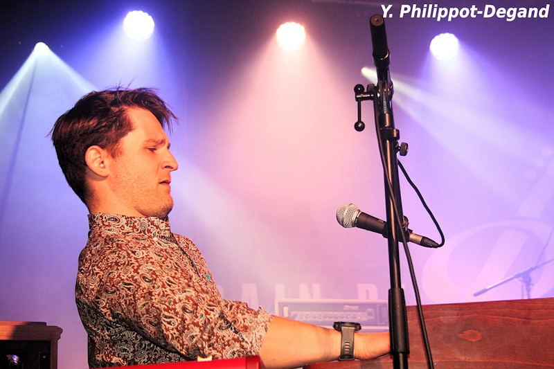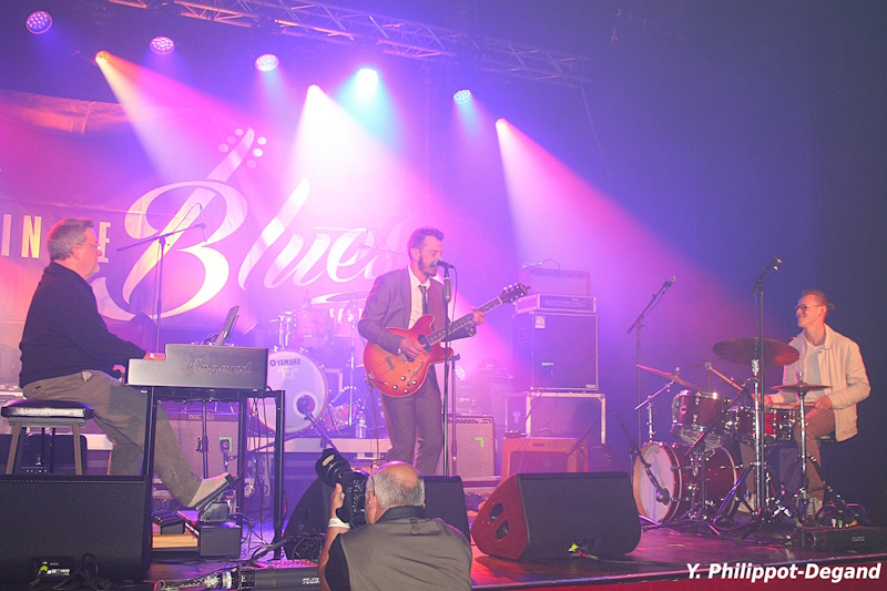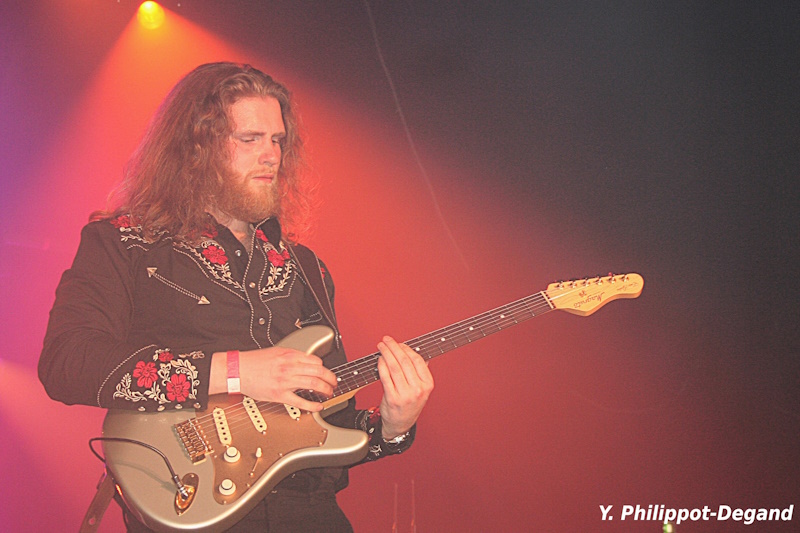 Première journée avec une moyenne d’âge très jeune car arrivent maintenant sur scène les Néerlandais de No King, qui savent d’emblée se rendre sympathiques quand leur organiste-chanteur Sjoerd Schelvis prend la peine de saluer le public en français. Tout de suite, le groupe impressionne par la technique irréprochable de tous ses membres et la voix sympathique de Sjoerd. Les amateurs de blues pur et dur pourront déplorer que parfois leur blues s’épelle r.o.c.k.. mais c’est dans leur contrat et la prestation possède une force et une cohésion impressionnante, toutefois non dénuée de fantaisie et de bonne humeur, comme le prouvera en fin de set le déplacement de Sjoerd Schelvis sur le devant de la scène, tenant à la main un petit clavier pour donner la réplique au guitariste Jelle Wunderink. L’immense bassiste Stijn Middelhuis et un très technique batteur qui ne semblait pas être Lars Middelhuis, en principe titulaire du poste, forment une sacrée rythmique qui propulse l’ensemble avec force et soutient parfaitement les envolées des deux autres membres. Le guitariste Jelle Wunderink fait le show, n’hésitant pas à jouer avec les dents, tout en montrant un indéniable feeling blues et des aptitudes impressionnantes à jouer les « shredders » quand le besoin s’en fait selon lui sentir. Efficace, énergique, spectaculaire, le groupe néerlandais a livré une excellente prestation qui a beaucoup plu à une partie du public, et un peu moins aux amateurs d’un feeling blues plus marqué.