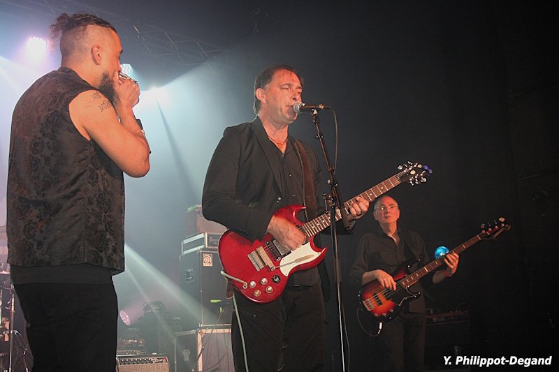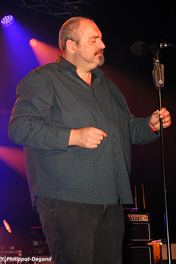 Pour terminer la soirée, les Belges de The Bluesbones se sont emparés avec beaucoup d’entrain de la scène autour de Nico De Cock, leur chaleureux chanteur. Leur guitariste habituel, Stef Paglia, était malheureusement absent, mais son remplaçant n’a pas manqué de se distinguer par des envolées au bottleneck répondant aux glissandi de l’orgue et en se montrant particulièrement habité sur un blues lent. La prestation énergique, très dynamique, propulsée par une rythmique très efficace, incluant parfois quelques accents funky (« The Witchdoctor »), un feeling à la fois boogie et soul (« Talking to the Lord »), ou une incursion dans un shuffle plus classique (« Devil’s Bride ») a totalement emporté le public encore présent malgré l’heure avancée, très enthousiaste, qui a réclamé avec force et insistance un rappel, commencé par un morceau funky très dansant, de quoi faire encore remuer le public malgré l’heure tardive, et terminé par un incroyable bœuf avec Jelle Wunderink, sur « Whiskey Drinking Woman », un blues coquin façon Chicago, avec des allusions grivoises dans les paroles, assez lent mais très carré, qui a fini par déraper complètement et se terminer par une orgie de guitares, les deux instrumentistes se renvoyant la balle avec brio dans un final échevelé. On sentait tous les musiciens heureux sur scène et le public, qui a complètement adhéré, les a plébiscités. Quelle soirée !