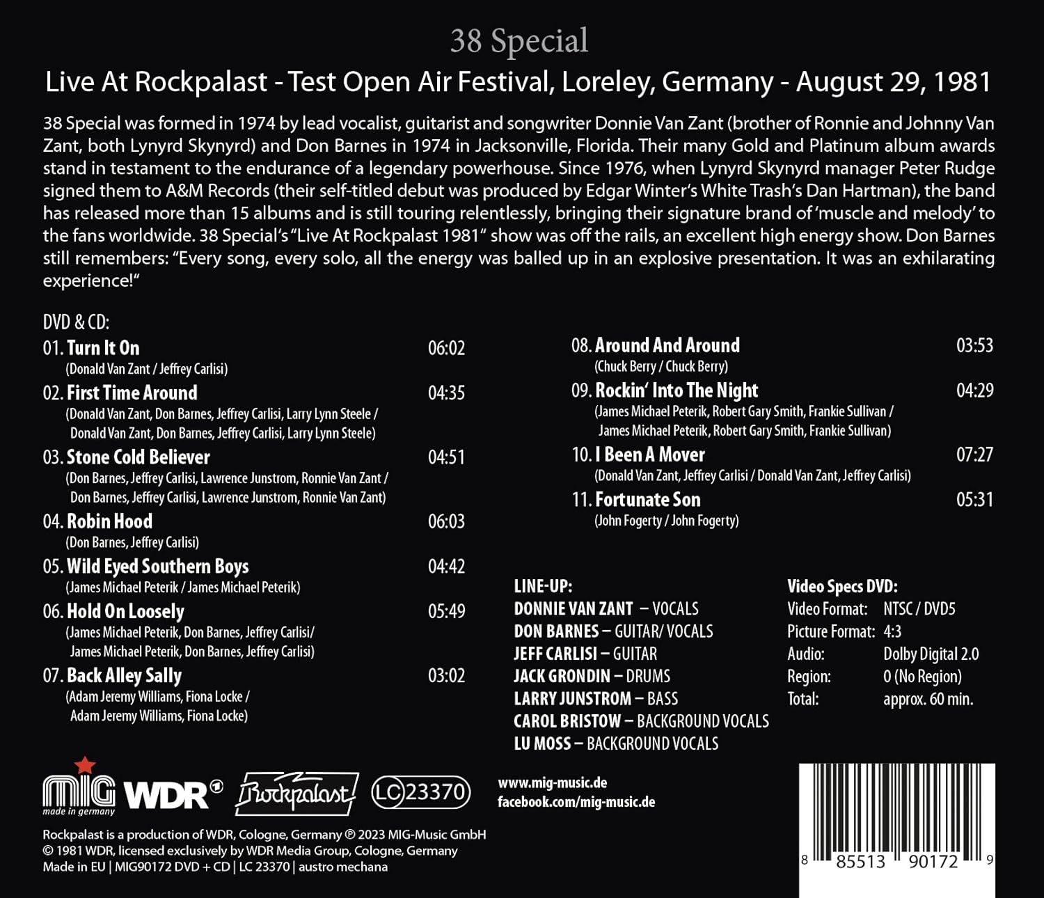 Rockpalast ! Combien sommes-nous à avoir attendu devant notre écran noir et blanc à l’époque de cette émission culte ! J’ai personnellement le souvenir de Lynyrd, Rory, J Geils qui ont marqué à jamais la tristesse de notre PAF de l’époque ! 38 Spécial, donc, va se produire le 29 août 1981, après avoir repris la route pour la promotion de leur album Wild Eyed Southern Boyz… Un peu controversé par le public du rock sudiste pour son virage FM, il va jouer tous ses succès : « Rocking into the nignt », le titre pré-cité, « Hold on losely » (énorme dans les charts MTV), « Stone cold believer », et va offrir une reprise de CCR en rappel, « Fortunate son ». À l’heure où de nombreux vieux fans se posent encore la question de savoir si ce groupe qui a vendu des millions de disques, reçu des albums d’or et de platine, est un groupe de rock, de rock sudiste, de rock FM…, force est de constater que leurs prestations scéniques sont irréprochables et, si elles n’apportent pas de réponse, offrent un immense plaisir.