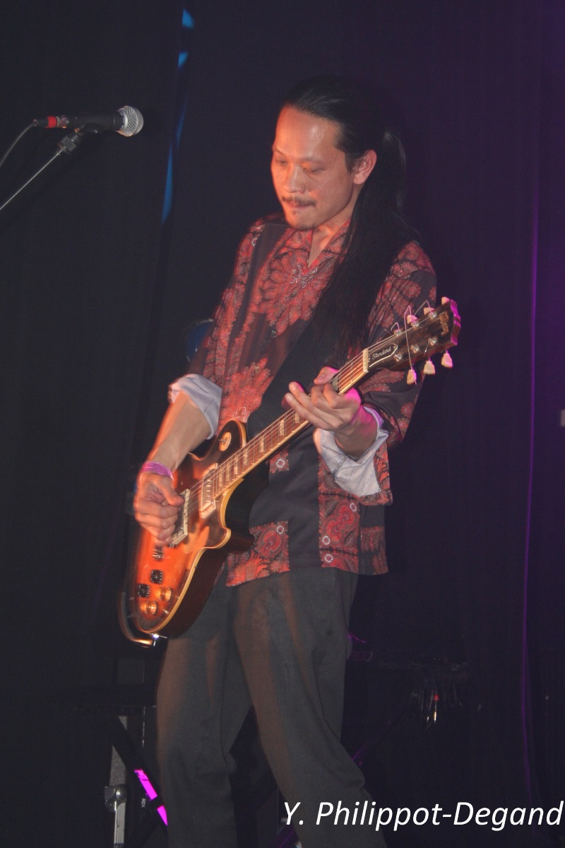 Pour terminer la soirée, l'équipe de Bain de Blues nous a emmenés un peu plus loin des racines de cette musique et nous a invités à nous plonger dans l'univers festif des Nantais de Fonky Nyko. On aime ou on n'aime pas, car on peut naviguer assez loin du blues le plus traditionnel cher à certains spectateurs. Le groupe présente la particularité de fonctionner avec un bassiste opérant à l'hélicon, ce qui donne au groupe un jeu de scène original et une assise rythmique particulière, d'autant que le sax donne aussi plutôt dans les graves puisqu'il s'agit d'un baryton. Alliance cuivre et bois, ça pousse fort du côté des vents, mais ça pousse aussi très fort du côté de la voix puissante, riche et bien posée de Nicolas Vallée. Les compositions sont servies par une énergie considérable et une très grosse mise en place, sans compter le jeu de guitare incendiaire de Niko « himself » lorsqu'il lâche son électroacoustique marquée à son nom pour une électrique. Cela fait contraste avec le jeu plus expérimental et plus planant de « Pop's » à l'autre guitare. Curieux brouet, mais qui fonctionne parfaitement sur scène et invite la partie du public qui a encore un peu d'énergie à se bouger.