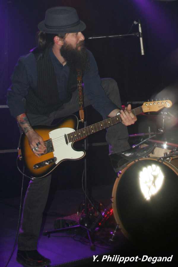 Tradition de Bain de Blues oblige, c'est à un groupe devant animer les inter-scènes qu'il revient de lancer le festival. Cette année, l'honneur de cette première prestation revenait à Blue Butter Pot, duo formé d'un chanteur-guitariste et d'un batteur et composé de l'ancien Texaroma (tiens tiens, quand on vous parle des liens avec le rock sudiste…) Rémy Bonnet, toujours aussi bon sur scène, arpentant la scène de ses longs compas et se permettant quelques acrobaties et sauts dans l'intensité du moment, formidablement soutenu aux fûts par Olivier Le Normand. Tout au long de la soirée, le duo nous a régalé de morceaux allant progressivement au cours de la soirée du folk-blues acoustique au rock énergique, avec quelques reprises quelquefois étonnantes de morceaux plus connus comme le « Personal Jesus » de Dépêche Mode ou le clin d'oeil/plagiat de Lennon avec les Beatles « Come Together », fortement inspiré du « You Can't Catch Me » de Chuck Berry. Les deux musiciens ont instauré une ambiance décontractée mettant tout de suite l'auditeur à l'aise, et le public a répondu très positivement. Voilà un duo de très grande qualité qu'il ne faut absolument pas rater s'il passe près de chez vous : assurément Blue Butter Pot fut d'emblée une des grandes réussites de cette édition.