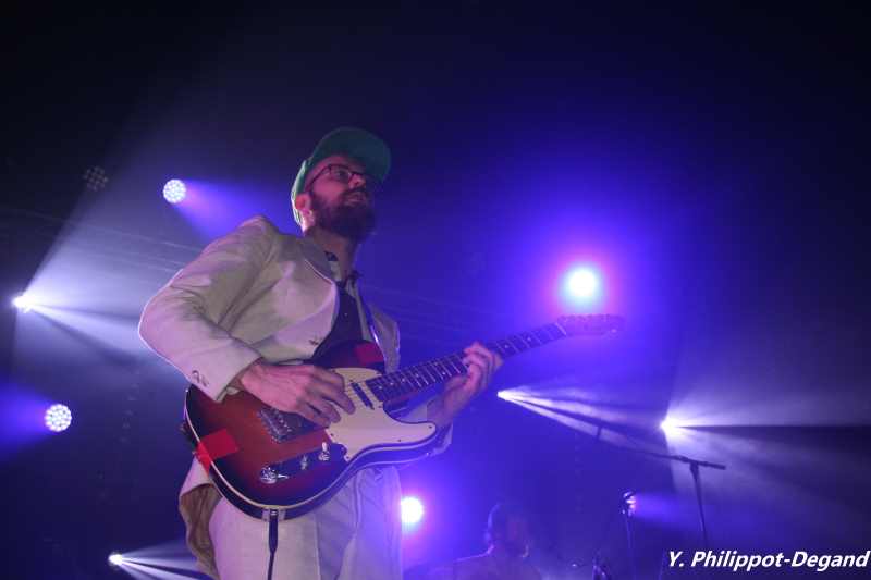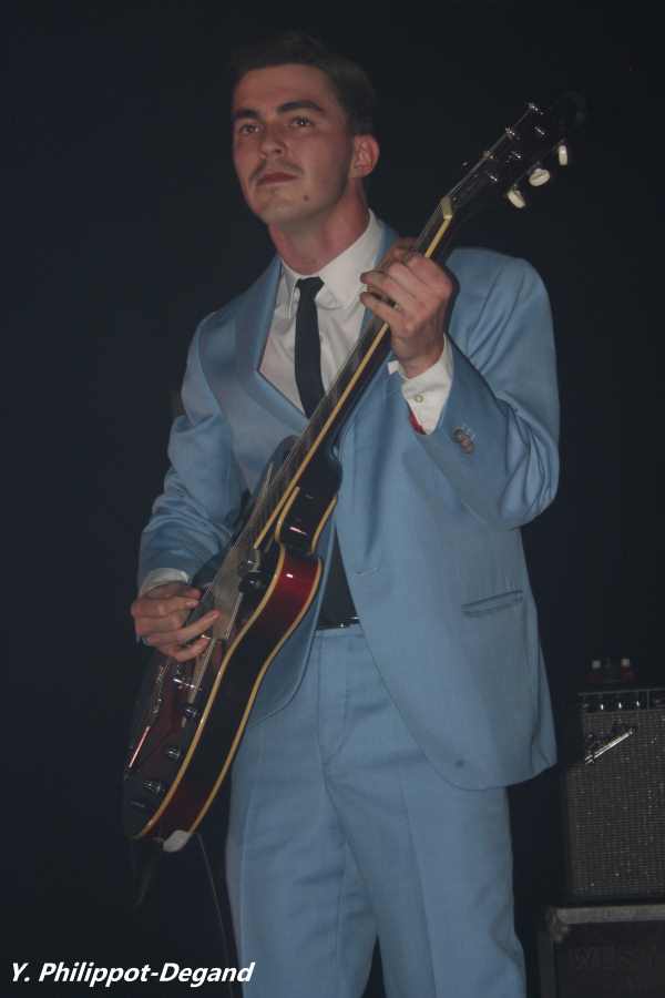 Le redoutable honneur de clôturer le festival revenait cette année à Alexis Evans et son groupe arborant des tenues harmonisées à l'instar des grands orchestres de swing de jadis. Malgré sa jeunesse, le guitariste n'a pas failli et a su conclure en beauté la manifestation, bien soutenu par la présence à l'autre guitare d'un Florian Royo qui a mis quelques morceaux avant de fournir le meilleur de lui-même (par contre, une fois lancé, le duo a fait des étincelles...). Présence souriante, bonne voix bien placée, le jeune guitariste a su imposer un swing funky/blues remuant assez large, au point de franchir les frontières du rock ou de la soul, du style à donner à un public de fin de soirée l'envie irrésistible de bouger encore un peu et permettant à chaque musicien de s'exprimer, y compris la section de vents (trompette + sax) donnant une jolie couleur rhythm'n'blues au groupe. De ce point de vue, la complicité visible et chaleureuse entretenue sur scène par Alexis avec ses musiciens contrastait avec le show précédent. Du coup, ça envoie sévère côté répertoire : avec ce genre de musiciens, la mise en place impeccable se trouve encore renforcée lorsqu'une pareille dynamique est générée, et ça se met à pulser assez méchamment. Toujours aussi sympathique, Alexis aura le bon esprit de faire vivre la tradition du bœuf et invitera en fin de prestation Max Genouel (guitare), puis Hugo Deviers (batterie), des Pathfinders, à le rejoindre sur scène pour deux titres : visiblement, le courant est bien passé entre ces musiciens de la même génération. En tous cas, le respect de cette tradition du blues a permis de clore le festival sur une note festive et conviviale du meilleur aloi. Merci Alexis !