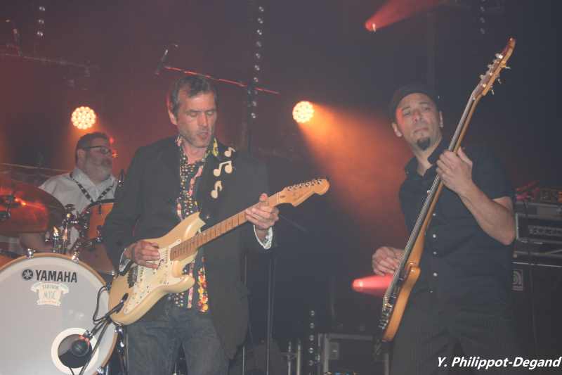 L’avantage à Bain de Bretagne, c’est qu’il est assez facile de se rendre du centre de la ville, où se trouvent les bars, à la salle du festival, un peu à l’extérieur, où le stationnement ne pose aucun problème. Pratique et économique, les ayatollahs anti-circulation des centre-villes en pleine agonie musicale feraient bien d’y songer… Nous y voilà donc revenus pour la deuxième soirée, entamée magistralement par le groupe chargé d’animer les inter-scènes. Les Barnguys nous arrivent de Normandie (région de Caen). Emmenés par leur clavier/chanteur Alexandre Lesueur, qui a exactement la voix qu’il faut pour ce genre de musique, et par un duo de guitaristes complémentaire et performant sur fond de rythmique inébranlable, ils nous plongent tout de suite dans leur redoutable rhythm'n’blues teinté de soul et de funk, bien en place, dynamique et d’une rare efficacité. Pourtant, ils étrennent quasiment là leur nouveau bassiste (sur l’album, c’est notre « célèbre » Julien Boisseau -Jesus Volt et Plug’n’Play- qui assure ponctuellement le job), et ils jouent des titres originaux, presque tous écrits par la paire Choubrac/Lesueur (à l’exception du poignant « Cold Cold Blues » écrit sur mesure par le Witch Doctor Jean-Christophe Pagnucco), mais rien ne semble pouvoir troubler les prestations impressionnantes de ce combo, malgré la difficulté de la tâche qui leur est confiée. A revoir absolument dans une apparition moins fractionnée. Décidément, pour les inter-scènes, nous aurons été particulièrement gâtés cette année !