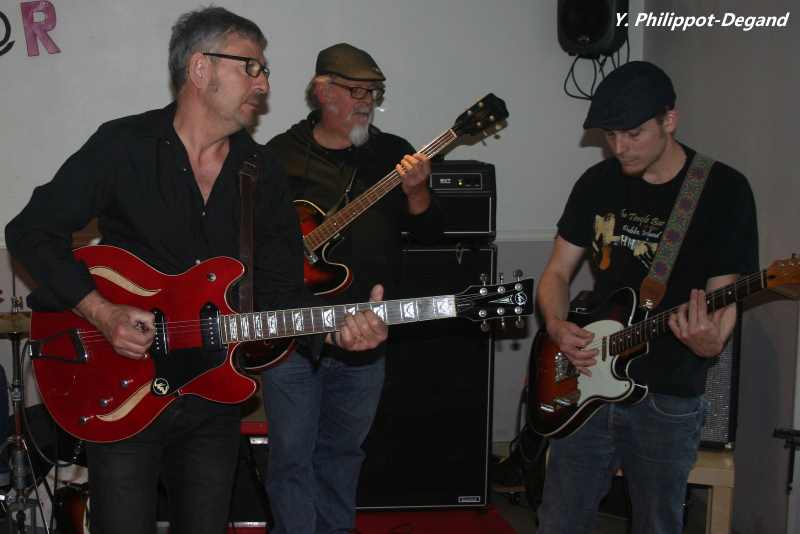 Juste le temps de foncer au Point B@r à quelques centaines de mètres, et d’y retrouver quelques têtes bien connues des amateurs de blues de la région : en effet Black Bus repose sur une base performante et bien rodée : la rythmique et deux guitaristes (dont le chanteur Jean-Pierre) du groupe régional Just In Blues, à laquelle se sont joints, à la place des habituels titulaires des postes, deux « petits jeunes » à la troisième guitare et à l’harmonica, de la même génération que Samson le deuxième guitariste du groupe. Bref, une sorte de Just In Blues rajeuni, les deux plus jeunes guitaristes étant des « fils de » membres du groupe, avec un répertoire un peu différent, mais qui nous montre une façon originale et agréable de passer le témoin entre générations. Est-ce utile de mentionner que l’ensemble fonctionne déjà plutôt bien et nous a fait là aussi passer un très bon moment ? Rassuré sur la relève, il est temps maintenant de foncer vers la suite du programme.