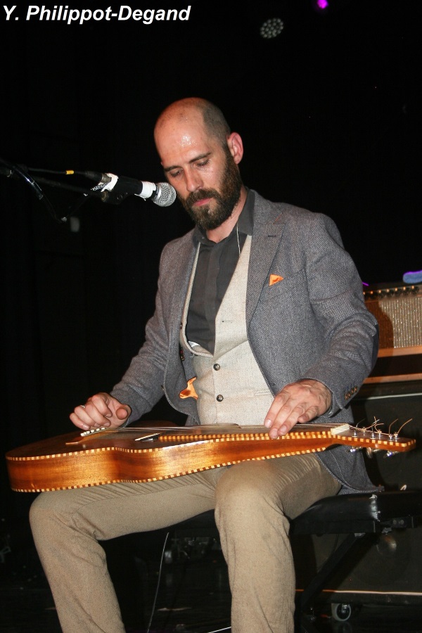 Difficile de passer après une telle tornade, mais Aymeric Maini s'y est employé avec talent, bien soutenu par son groupe très en place, essayant d'entraîner le public vers un registre plus dansant à base funky, mais aussi en réservant des moments plus intimistes dans une ambiance plus acoustique. Capable entre deux morceaux de tenir la scène seul avec sa pedal-steel pour un blues traditionnel poignant, il s'en tire avec les honneurs et gagne le respect et l'estime générale.