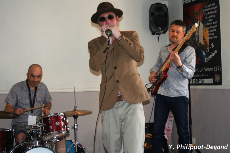 Le lendemain après-midi, malgré une nuit courte, il ne fallait pas rater les Bar'n'blues ! Dès 15h, les Angevins de Spoon entamaient les hostilités au Point B@r. Rythmique solide, jeu de guitare original sur deux doigts de Thierry Lepicier, la prestation se déroulait fort agréablement jusqu'à la première surprise du jour. Après quelques morceaux, le trio était rejoint par John Smith, l'harmoniciste des Big Sets, décidément adepte des événements inattendus, qui embarquait le groupe et l'assistance dans un formidable instant de convivialité musicale. L'intenable Anglais restera quasiment jusqu'au bout du set. Le public enchanté a réclamé un rappel qui permettra de remarquer les aptitudes de soliste du bassiste.