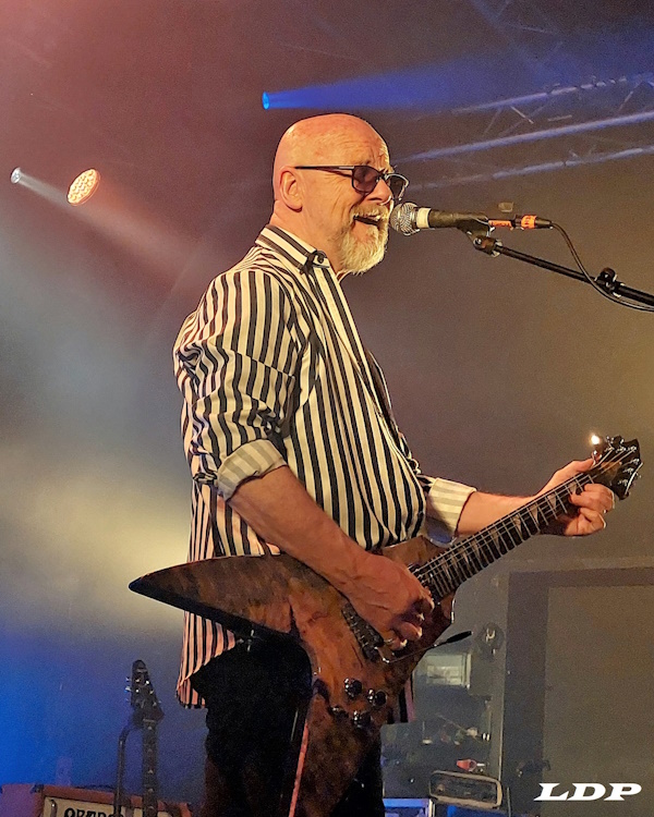 « Bonjour ! » : Andy Powell fait l’effort de placer quelques mots de français. Il s’y essaiera tout au long de la soirée. Le groupe démarre sur l’instrumental "In the Skin" qui fut le « single » de l’album « Nouveau Calls » en 1987. Le titre justifie la présence de la lap-steel dont Mark Abrahams s’empare avec assurance quand le morceau l’exige, en alternance avec sa splendide PRS. La version reste assez fidèle à l’original et on sent déjà que le groupe a la pêche ce soir. Andy s’est emparé d’une superbe guitare de luthier, une Case APJV carved top de 2014, de fabrication anglaise, dont les courbes viennent adoucir la forme générale inspirée par ses célèbres Flying V. Les amplis Orange Rockerverb 100 MKIII des guitaristes crachent avec vigueur mais sans abus : le niveau sonore reste très raisonnable. Tout est orienté vers le plaisir du public. Après ce brillant début, le groupe enchaîne sur deux compositions plus récentes, issues de leur dernier album, « Coat of Arms » (2020) : « We Stand As One », très bon titre de scène, fidèle à l’esprit du groupe, avec son passage hors tempo façon mandoline où s’exprime la PRS de Mark Abrahams, puis « Coat of Arms », le titre qui a donné son nom à l’album, notablement plus pêchu sur scène en raison de la prédominance dynamique du riff en boucle de Mark Abrahams, parfois doublé par Andy Powell, qui emporte la composition vers un univers hypnotique avant, après environ quatre minutes, de connaître une évolution vers d’autres couleurs sonores, avec plusieurs changements de tempo. Cette composition complexe de presque huit minutes flirte avec le rock progressif et offre un panorama varié de ce que peuvent proposer les musiciens : impressionnant ! Du grand art. Ce groupe n’a rien perdu de son inventivité et il le démontre y compris ce soir sur la scène du Big Band Café.