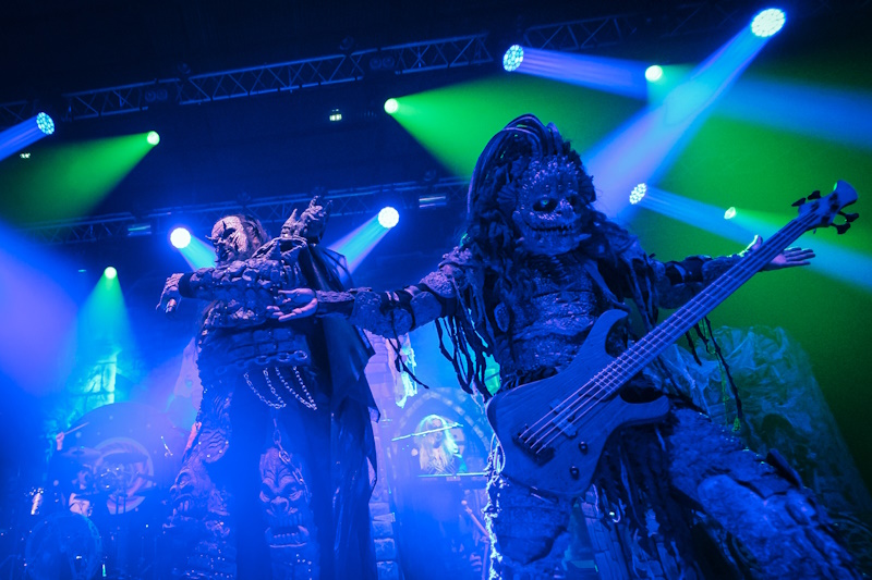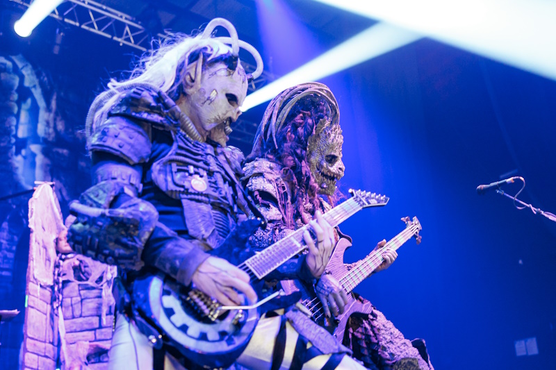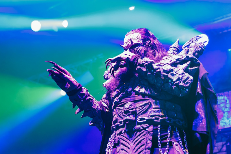 Le temps de débarrasser la scène et le « GOD OF THUNDER » de KISS résonne alors dans les enceintes : bonne entrée en matière, mais pourquoi passer l'intégralité du titre ? Beaucoup trop long. D'entrée le son est parfait mais très très insuffisant au niveau de la puissance sonore, j'en ai marre de cette vie de normes auxquelles nous sommes soumis, putain les mecs c'est un concert de MÉTAL, pas une sonate au clair de lune bordel ! (Comme dit Ted Nugent Loud is Better) LORDI rame, LORDI patine, le tempo est trop lent, les musiciens ont l'air fatigué, bref, au bout de deux titres la différence avec le groupe précédent saute manifestement aux yeux : ils se sont fait piquer le show, voler la vedette et ils rament, et ça se voit, ça se sent.