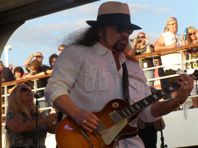 Dès les premières heures du vendredi matin, les conversations vont bon train pendant le "petit déj' " où se retrouvent les fans et beaucoup de membres des groupes qui n'hésitent pas à échanger des amabilités et même converser avec les fans : ça change complètement des concerts calés tout au long de l'année ! Manger, concert, boire, manger, boire, concert... c'est en gros le rythme auquel on est confronté (dur dur pour des rockers, non ? Ha ha ha), et donc, après quelques apéros de mise en forme, beaucoup se retrouvent en début d'après-midi sur le pont pour le show de Tom Hambridge, un show très rock'n roll où le Canadien reprendra (entre autres) "Sweet Mama" et "Thing I Miss The Most", des titres qu'il a co-écrits pour Skynyrd ou Van Zant ! Juste un petit moment de répit et c'est Little Feat qui prendra le relais.